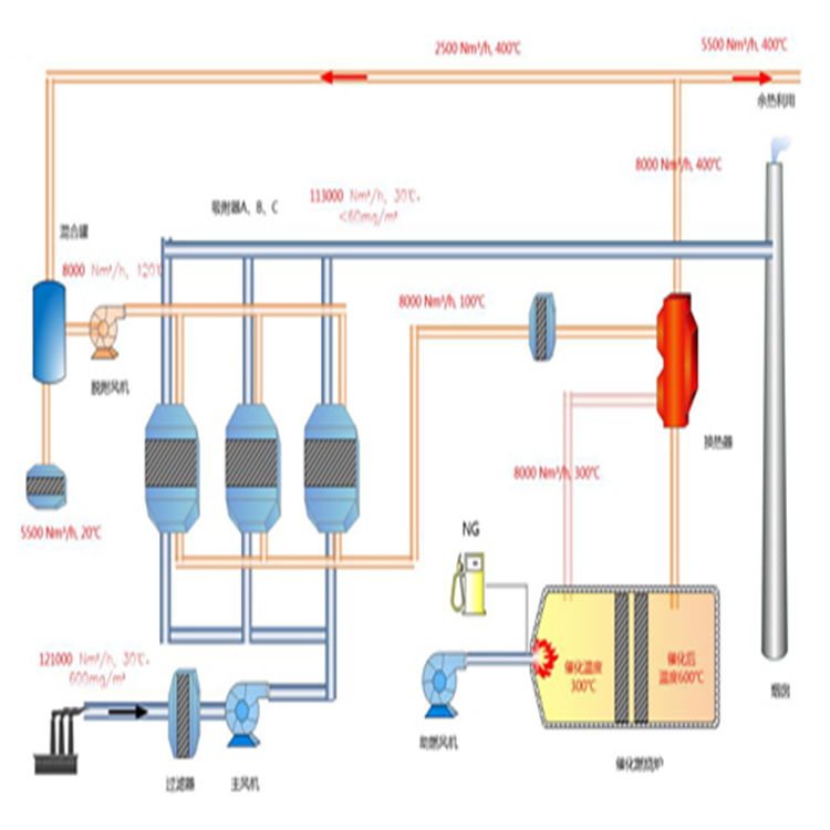 混合氣體通過溫度略低的蓄熱陶瓷流動。大量的熱能從煙氣轉(zhuǎn)移到蓄熱體,用于加熱下一個循環(huán)的有機(jī)廢氣。高溫?zé)煔獗旧淼臏囟却蟠蠼档?,然后通過熱回收系統(tǒng)和其他介質(zhì)進(jìn)行熱交換,煙氣溫度進(jìn)一步降低,排放到室外空氣中。